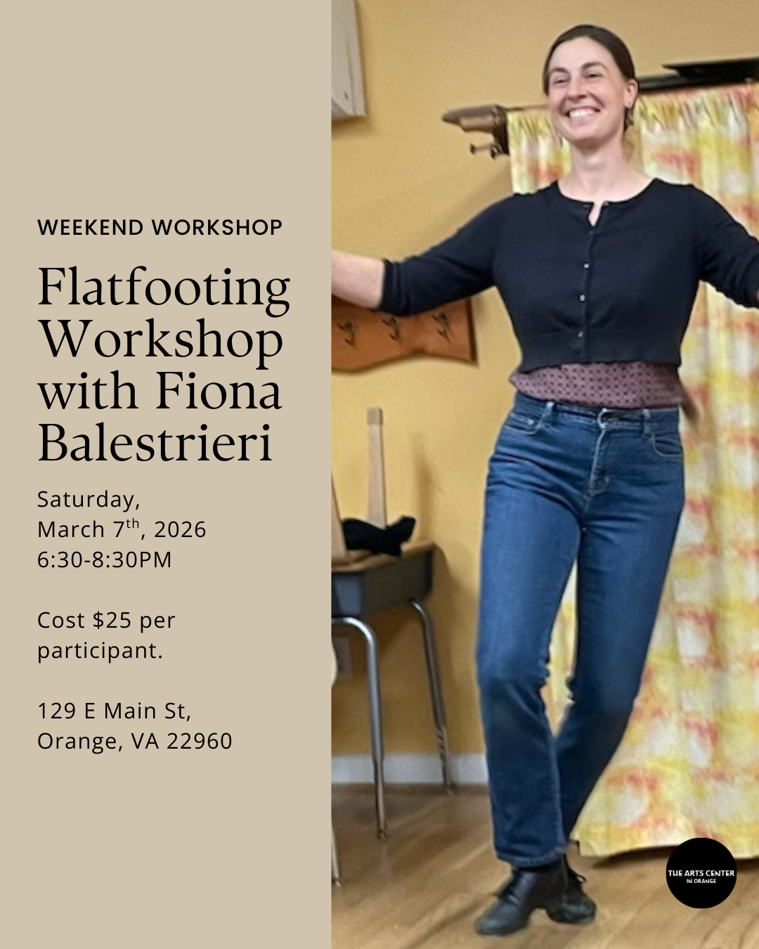 Flat-foot dancing is a percussive, low-to-the-ground style of dance found in Appalachian regions. It’s essentially like making music with your feet. Come learn the basic moves with seasoned dancer and instructor, Fiona Balestrieri, and practice to live music provided by the Arts Center in Orange’s musician-artist Alex Caton, her mentee Jake Smith and maybe another surprise guest or two. We may even have time to run a square dance or two as well. Low-heel, flat shows are best for this event!