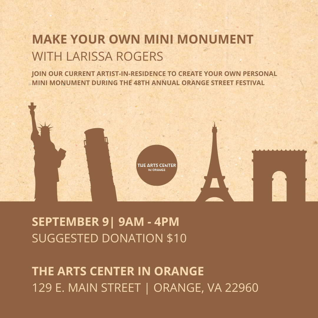 Stop by during the Orange Street Festival and create your own mini monument in clay! Led by our current Artist-in-Residence LaRissa Rogers, this activity is fun for ages 8+. Participants will learn the basics of ceramic handbuilding, and will be able to pick up their creations from The Arts Center in Orange the following week.