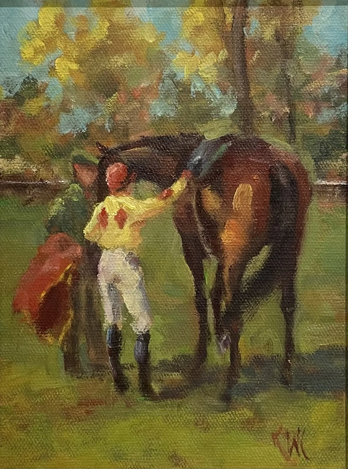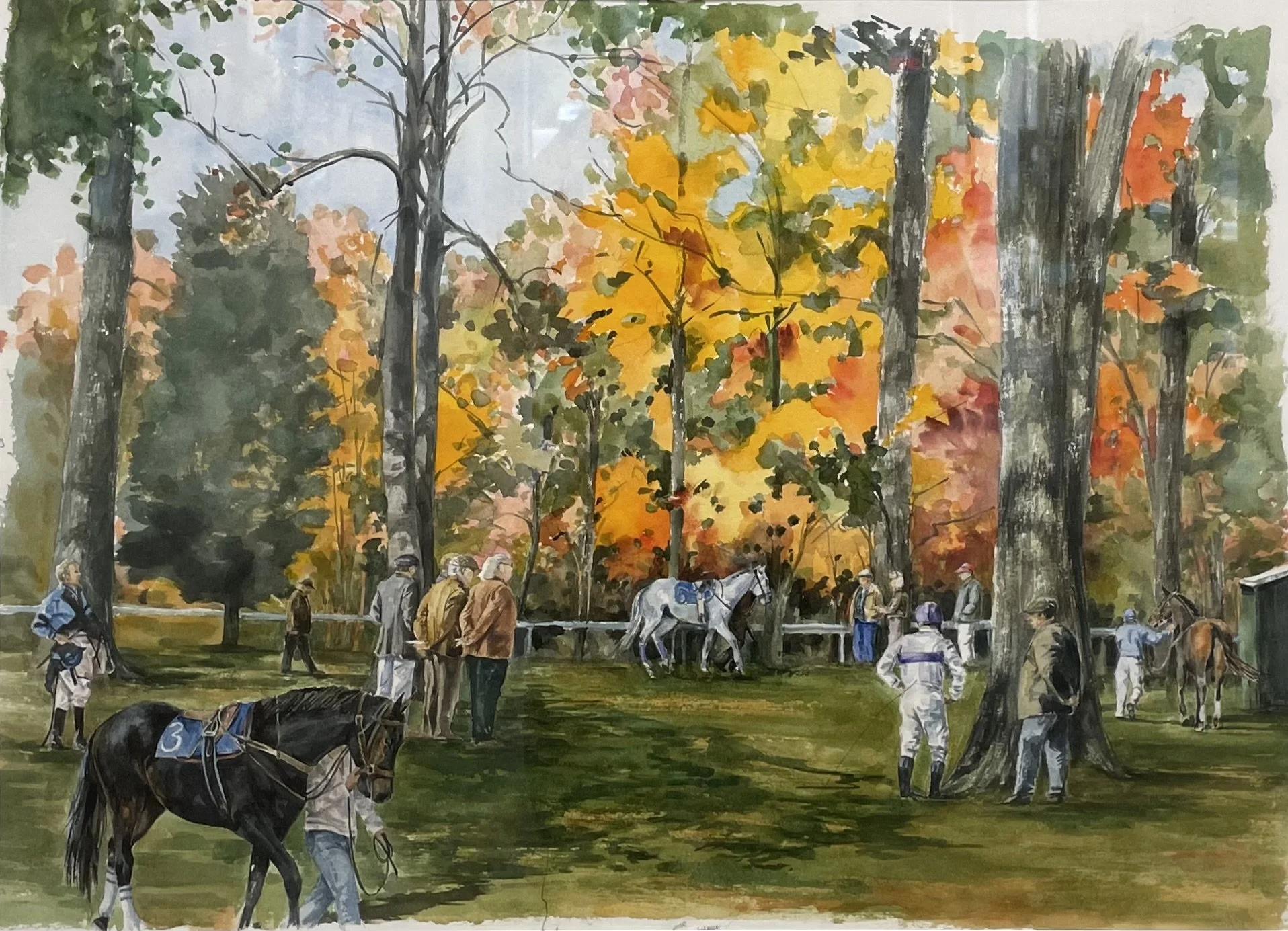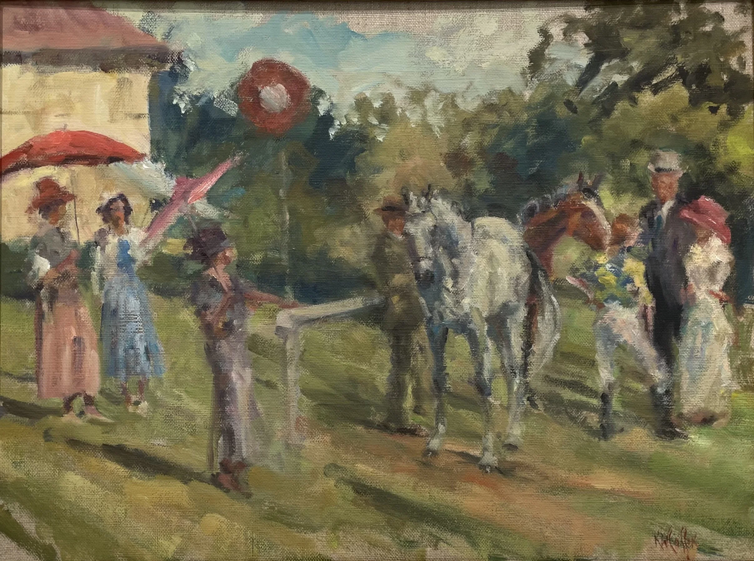 Shira created two paintings for the Montpelier Hunt Races, first in 2006 showing the start, a view very few race goers get to see as it occurs on the far side of the racecourse. The second painting, for the 2011 poster, is a paddock scene which is displayed in this exhibition.
