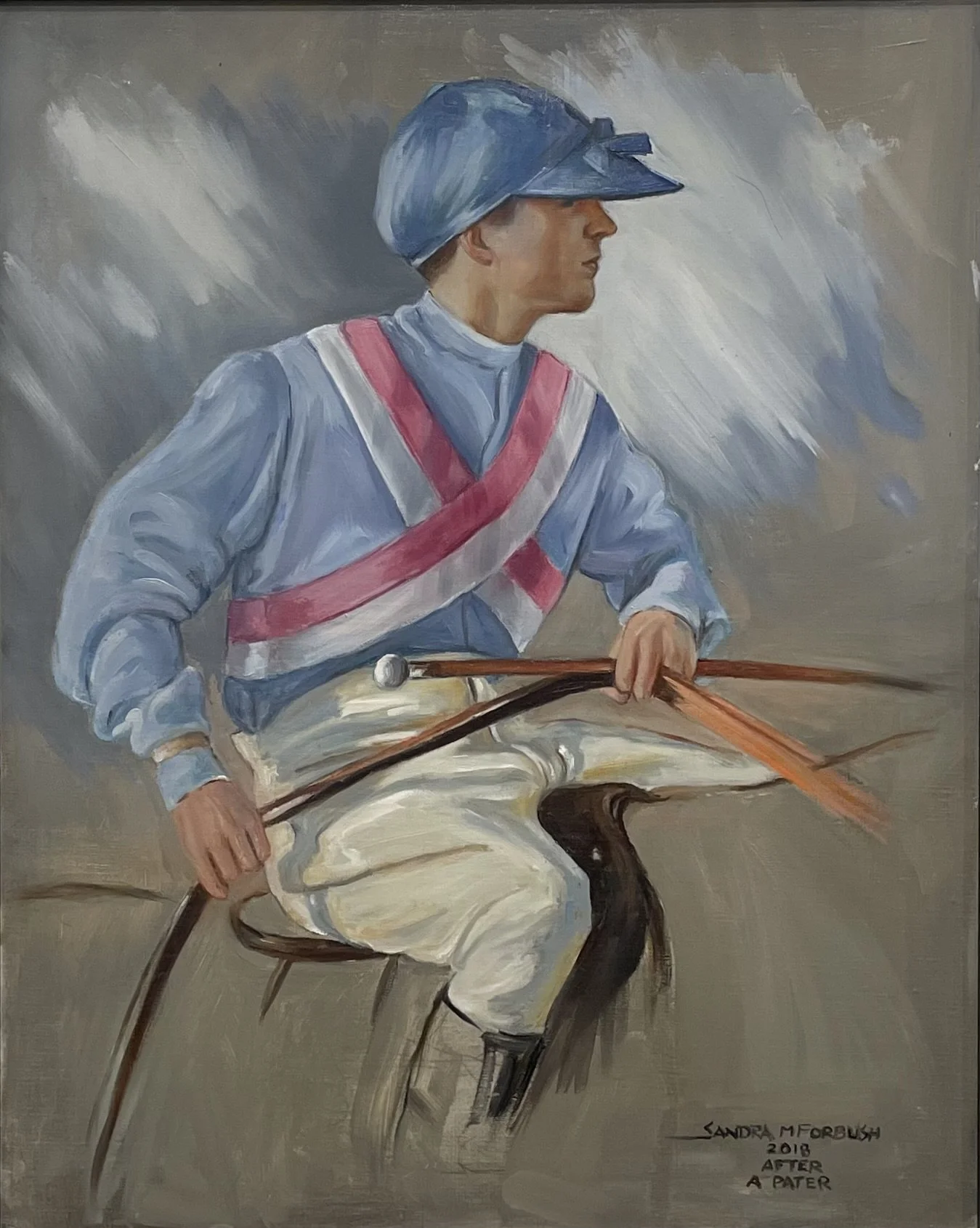 Forbush has painted two paintings for the Montpelier Hunt Races. The first in 1994 of a “cocky jockey” from the back sporting Marion DuPont Scott’s silks is arguably the most popular poster to date. Her second poster, from 2018, she revisited the jockey theme with a dramatic pose of a young jockey in the same DuPont Scott silks. Both of her posters are on display in the exhibition along with the original 2018 painting.