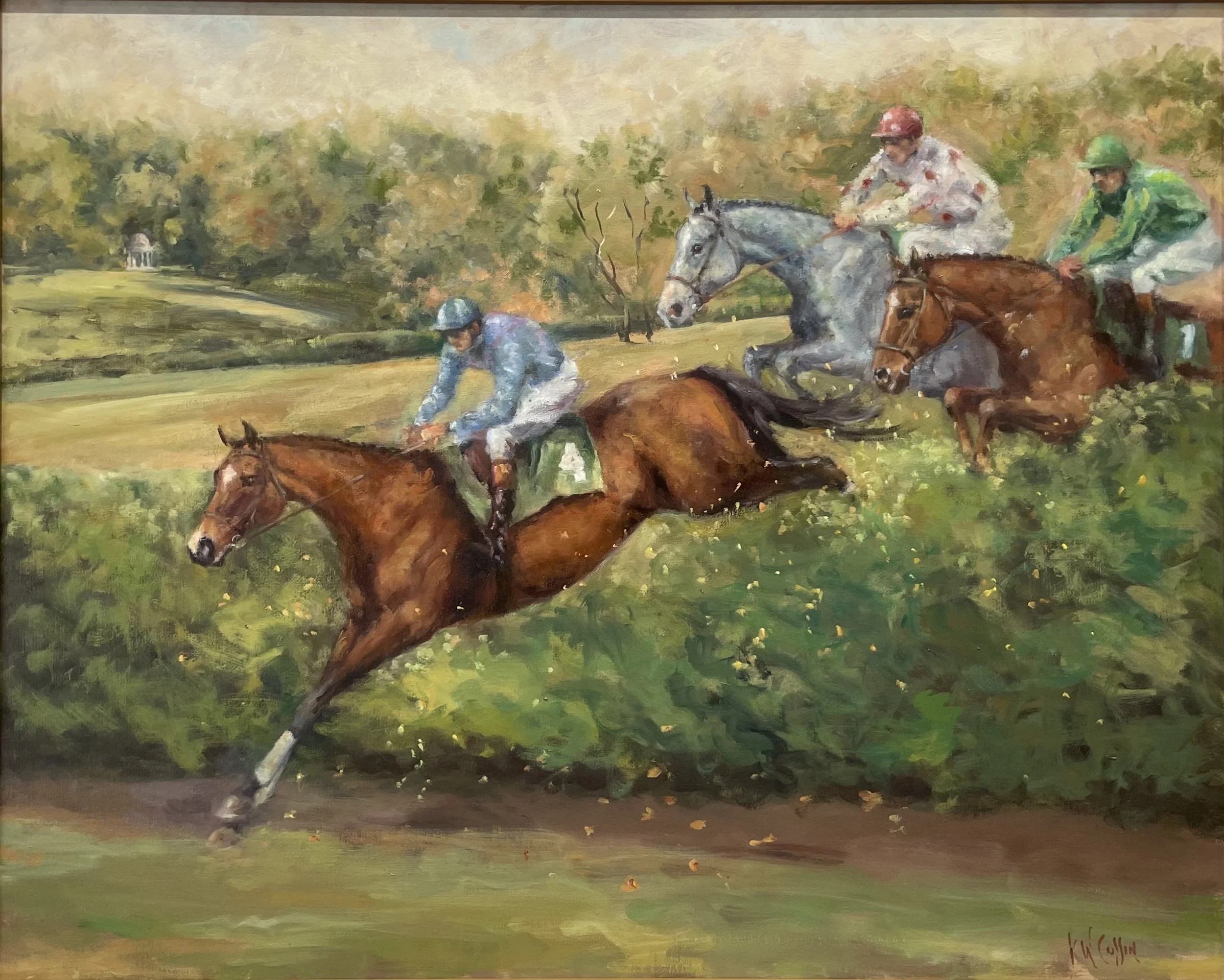 Coffin chose a view of steeplechasers clearing the iconic Montpelier brush hedge for her 2015 painting. Montpelier has the only completed course of natural brush jumps on the steeplechase circuit. In this painting the Mansion is shown after the restoration, as it was in the Madison’s tenure.