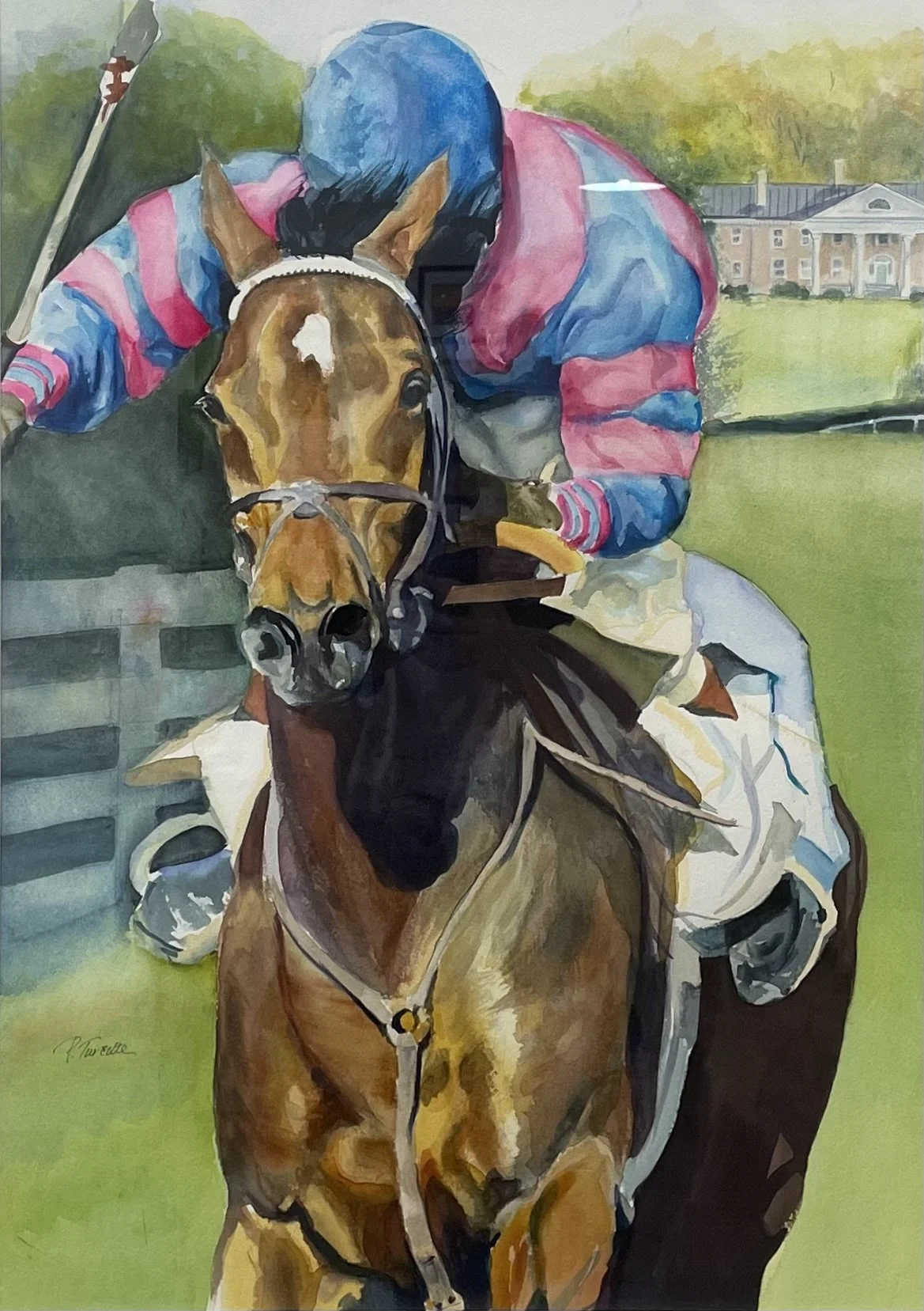 Turcotte has created two paintings for the Montpelier Hunt Races, one in 1999 and one in 2000. Her 1999 painting shown in this exhibition, a dramatic view of a racehorse in Marion DuPont Scott’s silks racing towards you with the Montpelier Mansion as it was in Mrs. Scott’s day in the background. The 2000 painting is a view of the Paddock with the Temple in the background.